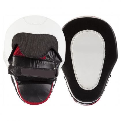 High quality curved training pad made of genuine leather. Light weight durable solid as a pair. Machine mould padding with ball grip palm. Buckle strap with velcro closure. Interior has breathable linning with extra padding to support wrist. Height: 28 cm, Length: 21 cm, Width: 5 cm. Also available in split and synthetic leather
