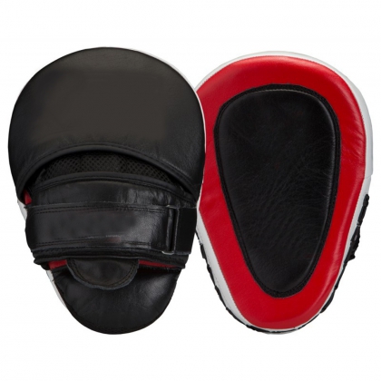 High quality curved training pad made of genuine leather. Light weight durable solid as a pair. Machine mould padding with ball grip palm. Buckle strap with velcro closure. Interior has breathable linning with extra padding to support wrist. Height: 28 cm, Length: 21 cm, Width: 5 cm. Also available in split and synthetic leather