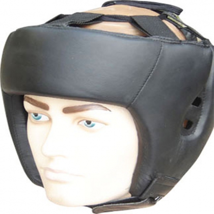 Genuine cowhide leather outside for durability with soft PU inside for comfort. Hard EVA padding outside with soft foam padding inside. Chin features the same with EVA padding around ears. Leather strap on top, enclosed with velcro closure on the back. Also available in buffalo leather. Size: S, M, L, X