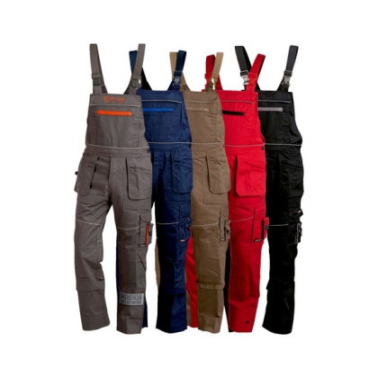 100% COTTON OR POLY/COTTON WOVEN FABRIC 190-350 GSM FABRIC, ANY COLOR BIB OVERALL HAVING CHEST CENTERED MULTIPLE POCKETS WITH VELCROP FLAP & LOOPED OPENER, SIDE REAR POCKETS ON PANT. METAL HOOKED LOOP WITH BUTTON CLOSURE FOR ADJUSTABLE SHOULDER STRAPS